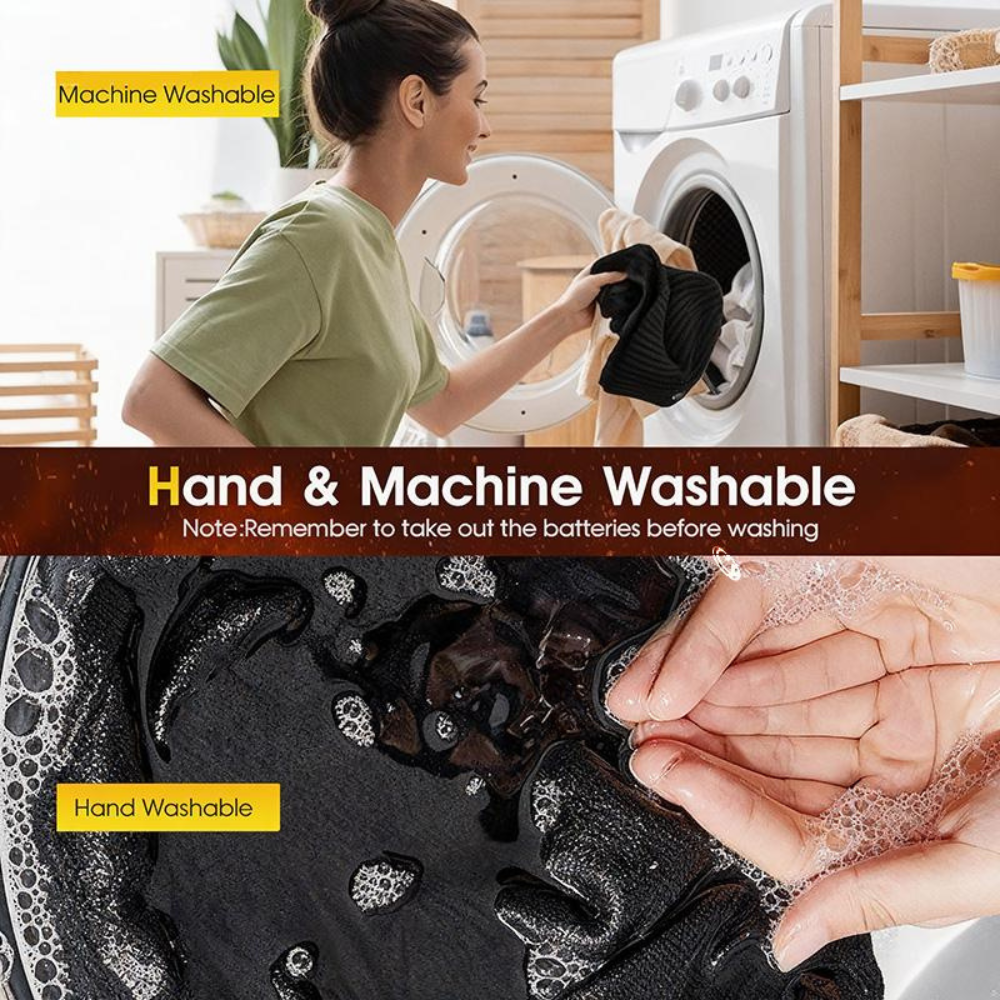Yes. Remove the battery and tuck the cable. Hand wash or machine wash inside the included laundry bag then lay flat to dry.